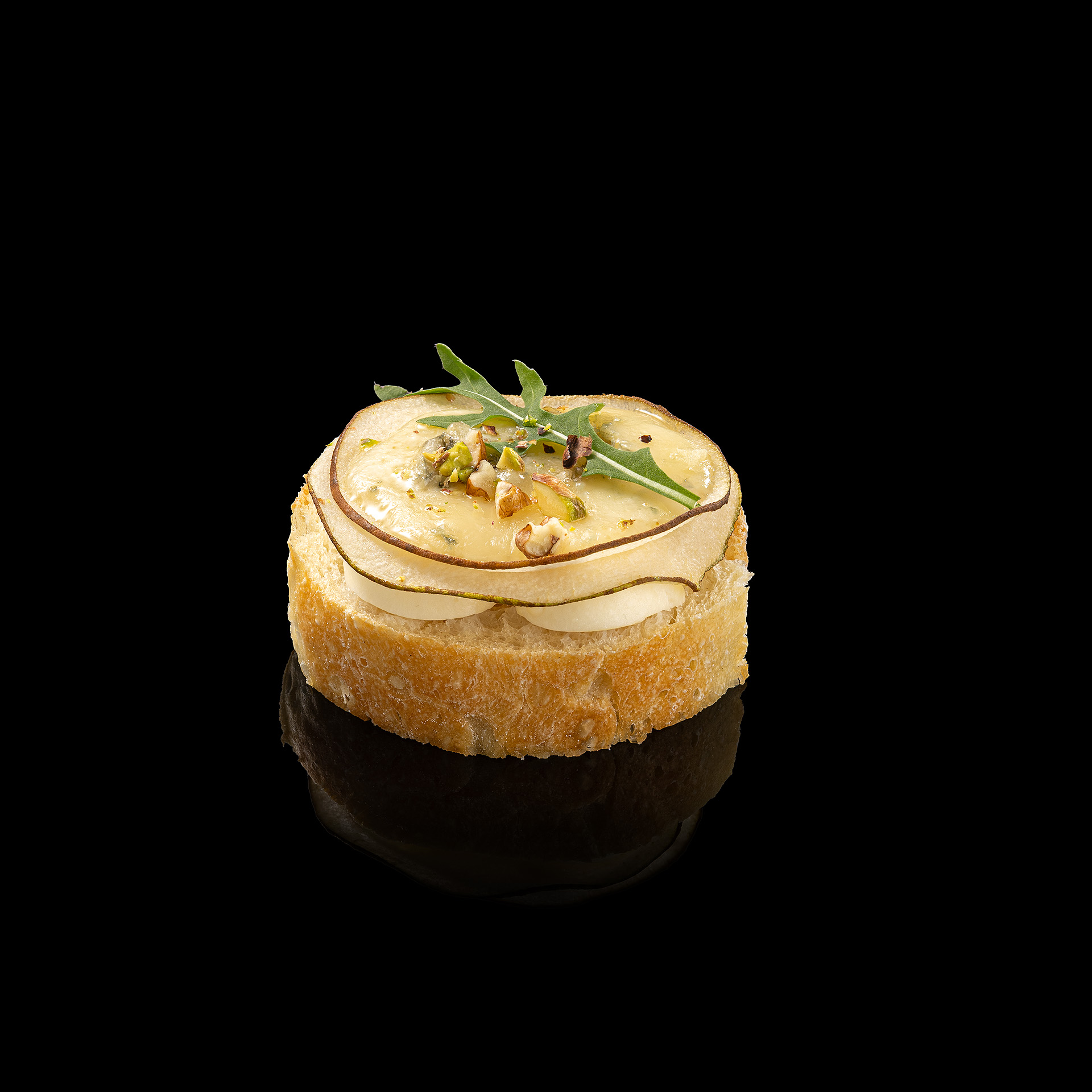 Брускета з грушею – хрустка чіабата з карамелізованою грушею, горгонзолою, моцарелою, руколою та фісташками — 10 шт × 45 г