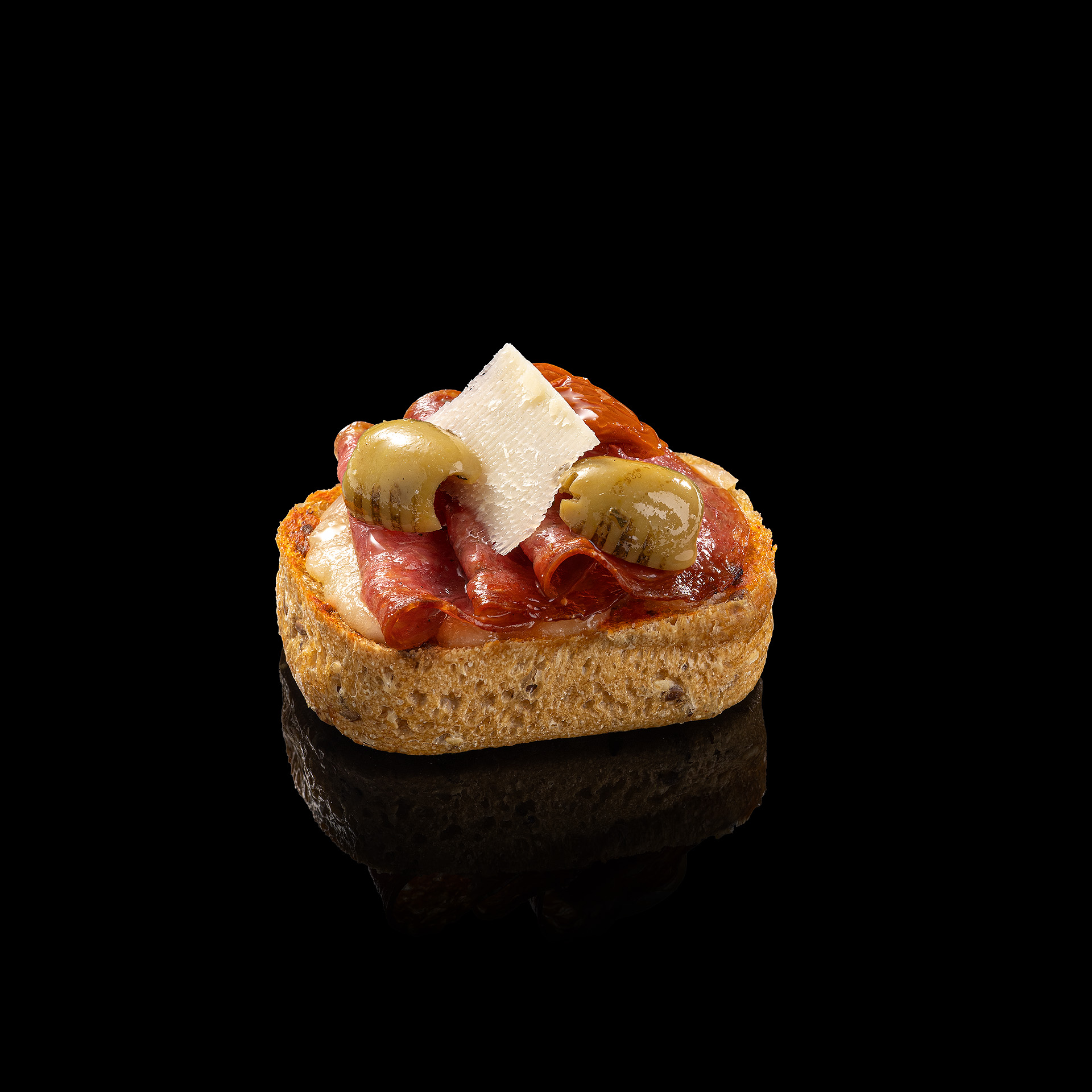Брускета з салямі Наполі – мультизерновий багет із томатним соусом, моцарелою, салямі Наполі, грильованими оливками, в’яленими томатами та свіжим базиліком — 10 шт × 50 г