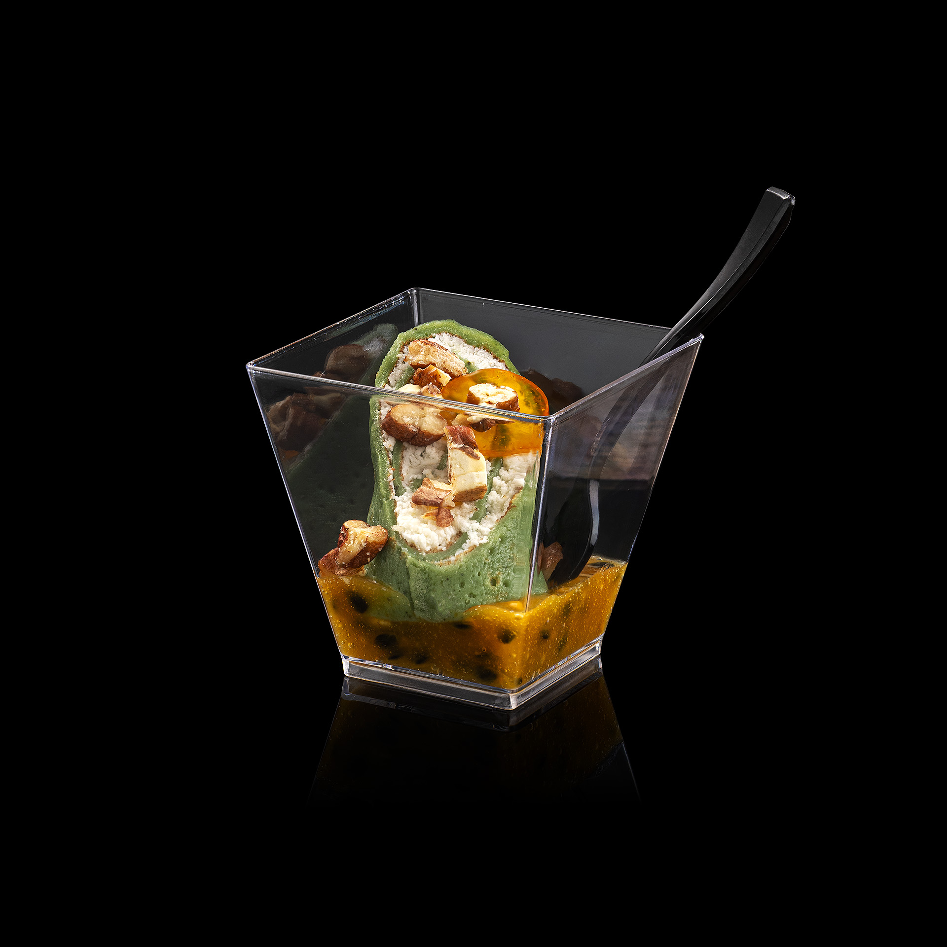 Матча млинець із кокосовим кремом і свіжим манго, на пюре з маракуї з карамелізованим кумкватом 10 шт × 55 г